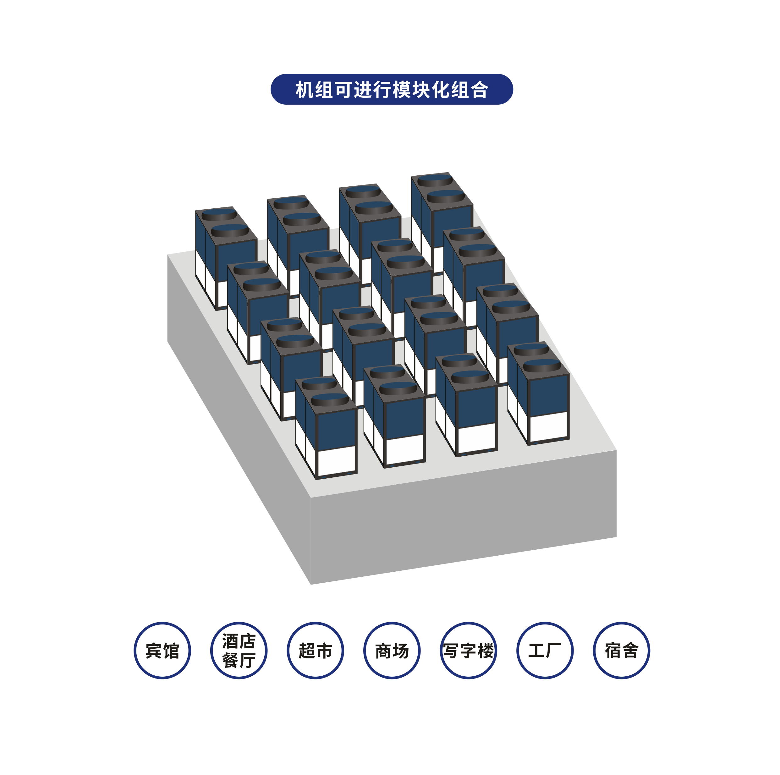 鸿禾空气源冷暖模块机是以空气为冷热源,水作为传热介质的中央空调机组,该机组广泛适用于新建和改建的大小工业与民用建筑工程、对运行噪音和周围环境有较高要求、缺水或不便安装冷却塔的场所。